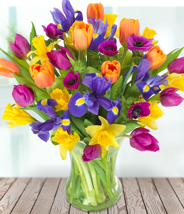Vibrant iris, sunny daffodils, lush anemones and fresh tulips mingle to create a bouquet that is sure to put a spring in your step. Delivered whilst still in bud which prolongs the life of the bouquet and means the recipient can enjoy the full life of the bouquet.